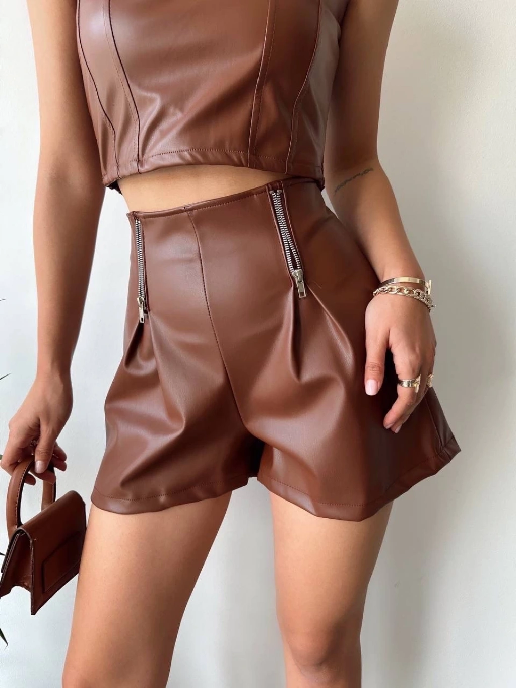 Çift fermuar detaylarıyla şıklığı ve rahatlığı bir arada sunan Kahve Deri Şort ile tarzınızı yansıtın.