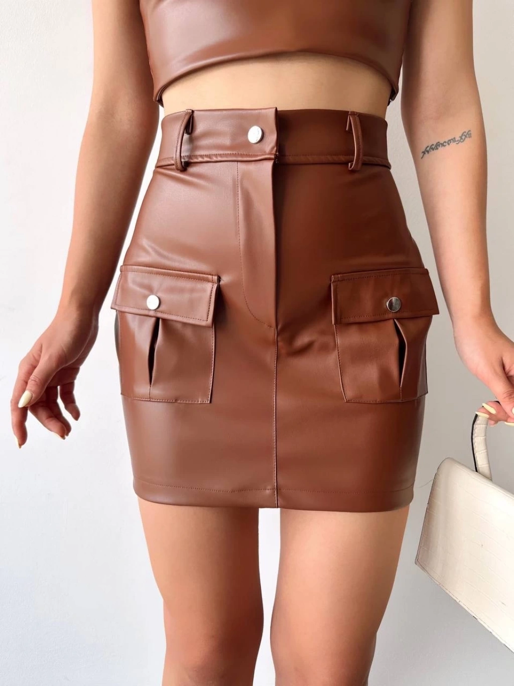 Önden iki cepli deri etek kahve h240040